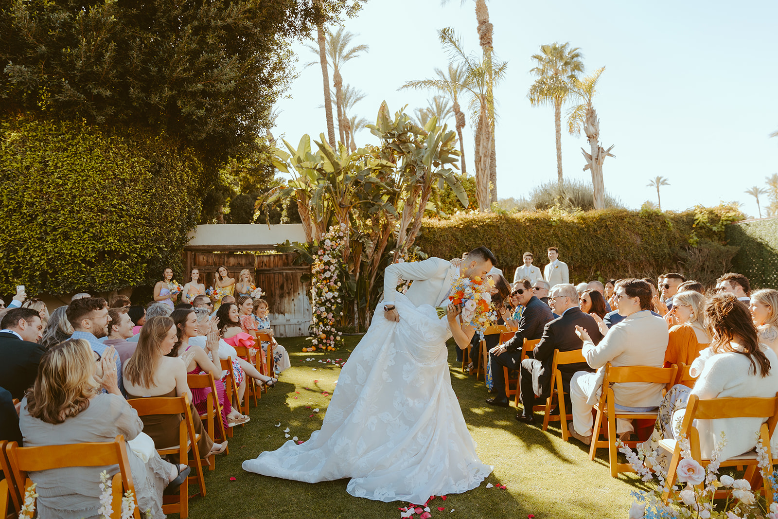 Natalie + Patrick got married at the Cree Estate in Palm Springs, California at a cool little Airbnb. This place was SO cool, it had three pools (one of them being the deepest pool in Palm Springs), it had a tennis court, multiple different spaces for the ceremony and reception and lots of really cool trees + plants. Natalie and Patrick got ready separetly and then we did their first look in front of the house. Their ceremony was STUNNING and they were married by Patrick's grandfather. They had lots of fruit for the ceremony in the floral arch, and again at the reception. The party was CRAZY and we had late night in-n-out brought in. It was SO fun.